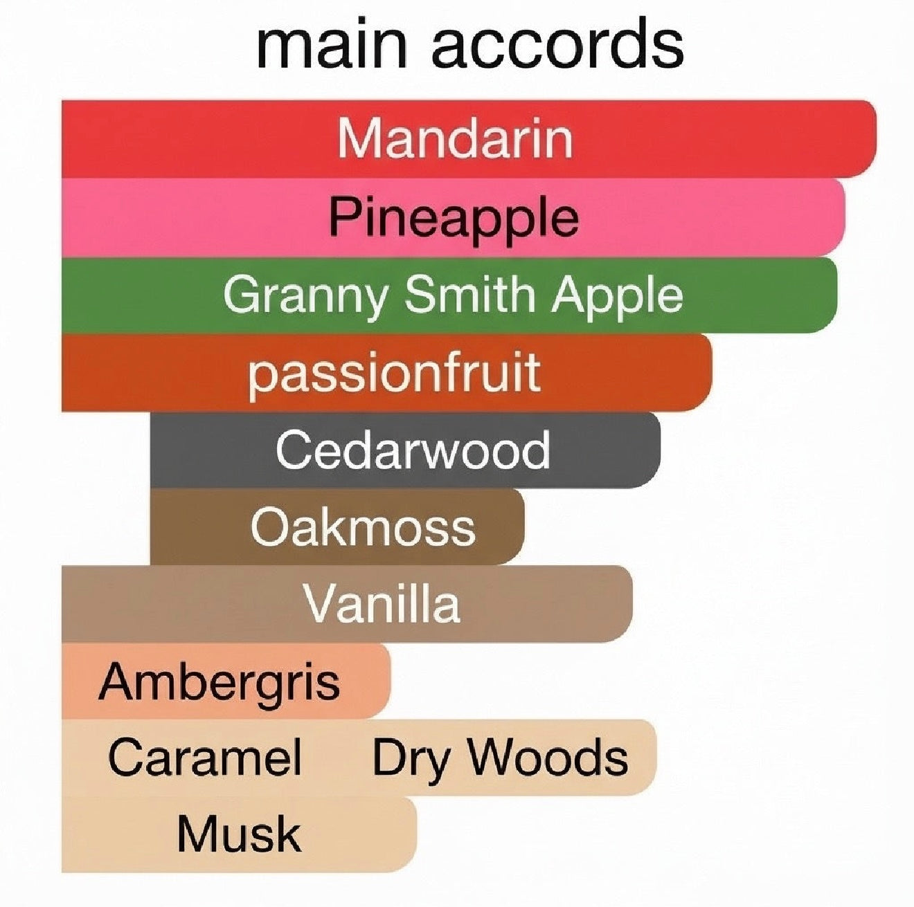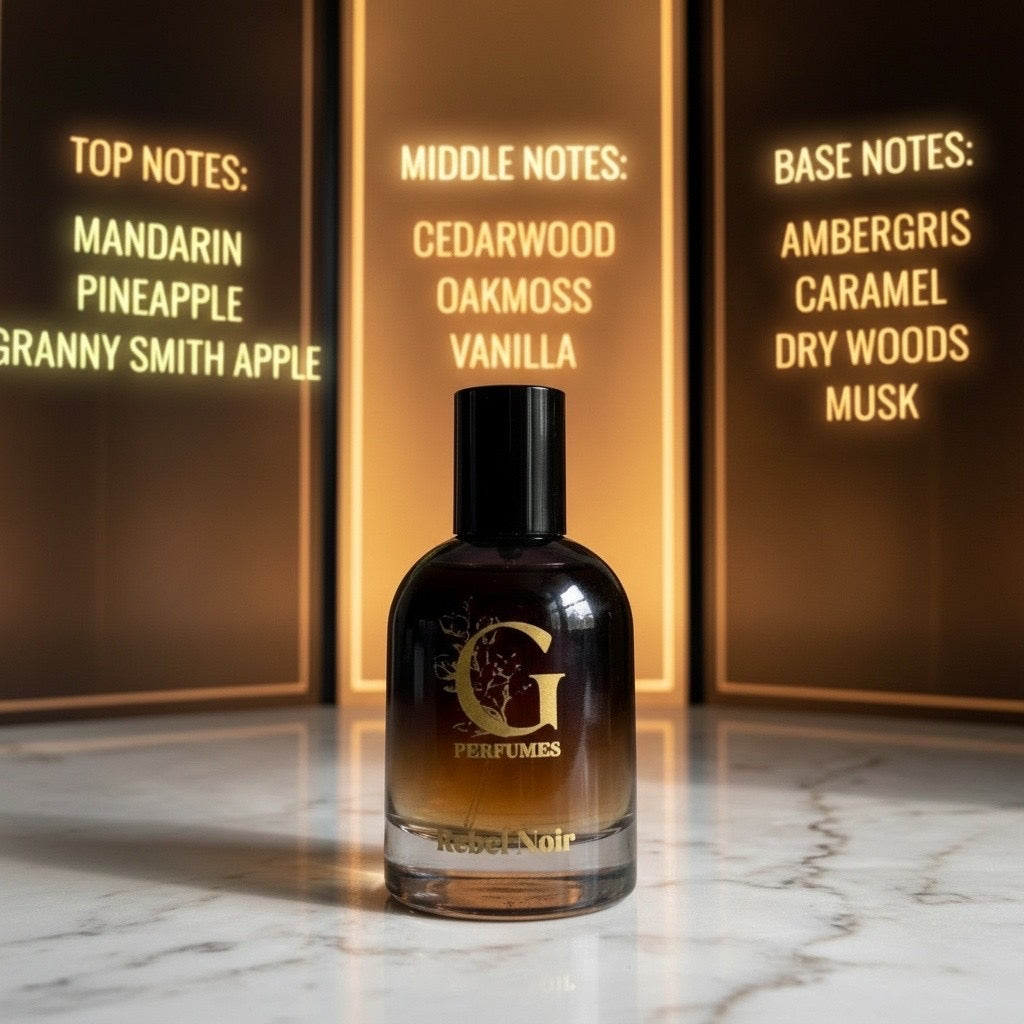Rebel Noir is a daring fusion of contrasts, bursting with zesty mandarin, sweet pineapple, and crisp Granny Smith apple upfront. As it evolves, cedarwood and oakmoss add earthy depth, softened by warm vanilla. The base notes of ambergris, caramel, dry woods, and musk create a sensual, addictive trail – perfect for those who live on their own terms.